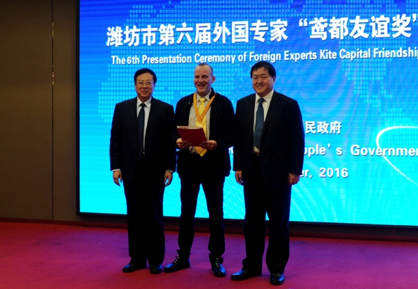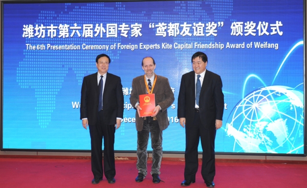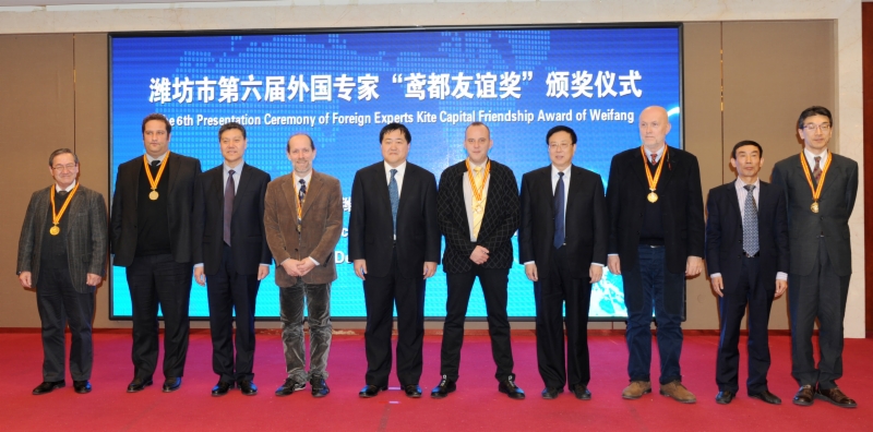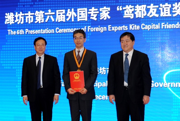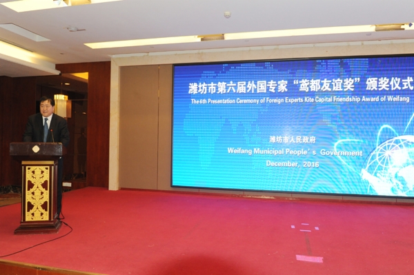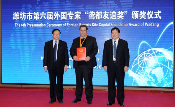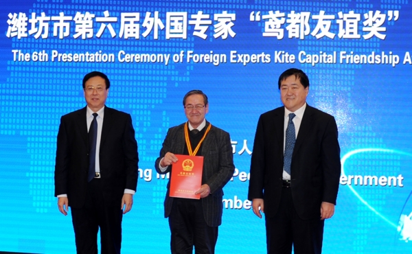 近日,我市举行第六届外国专家“鸢都友谊奖”颁奖仪式,为10名在潍工作的外国专家颁发“鸢都友谊奖”。潍坊市副市长、市政府党组成员刘建国;市政协党组成员,市人社局党委书记、局长李静波出席仪式并为获奖专家颁奖。