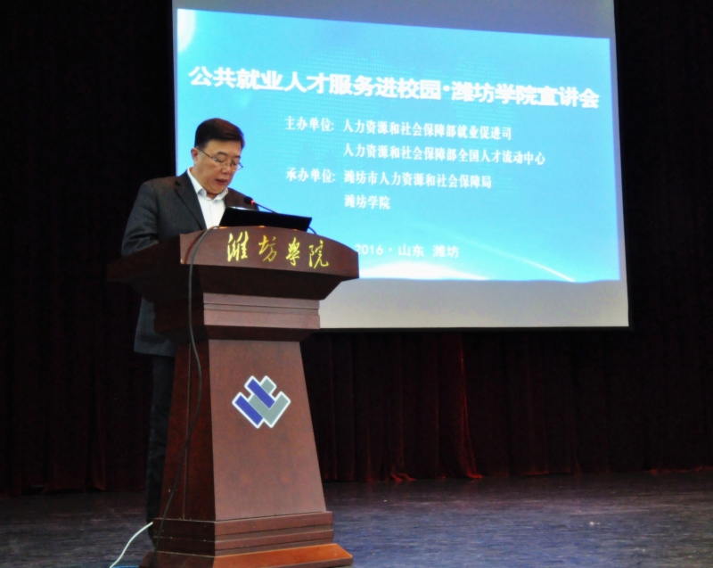 潍坊市大中专毕业生就业指导中心、潍坊市大学生创新创业管理服务中心主任王术平在宣讲会上分析了大学生就业形势、就业途径,并介绍了潍坊市为促进大学生就业创业所出台的一系列就业创业政策和具体举措。