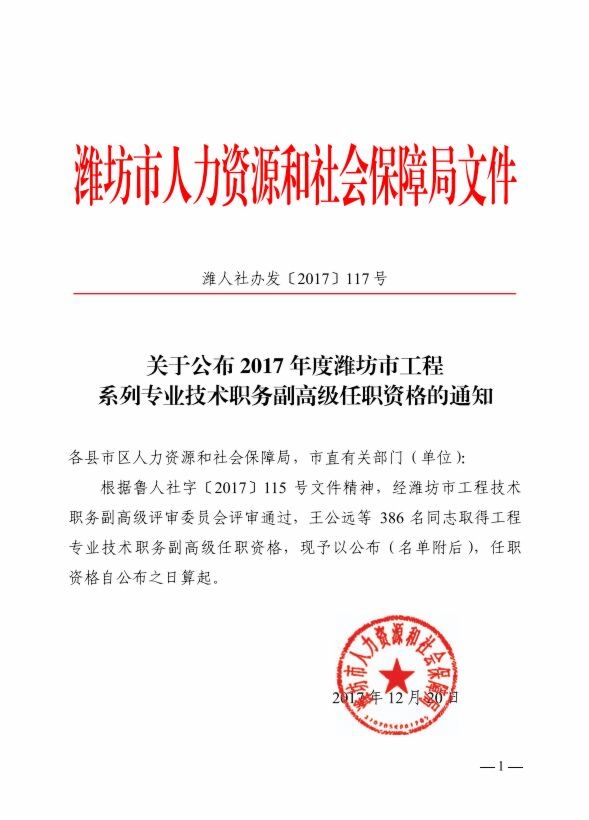 关于公布2017年度潍坊市工程系列专业技术职务副高级任职资格的通知