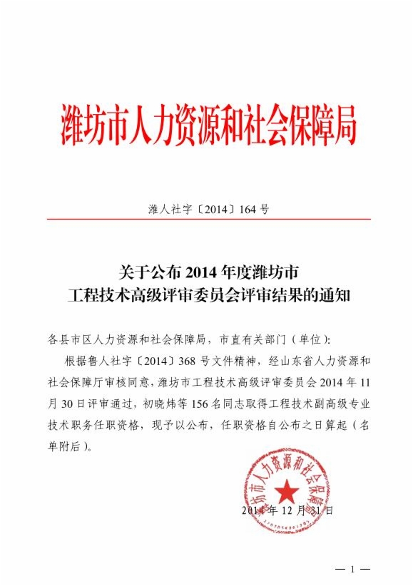 关于公布2014年度潍坊市工程技术高级评审委员会评审结果的通知