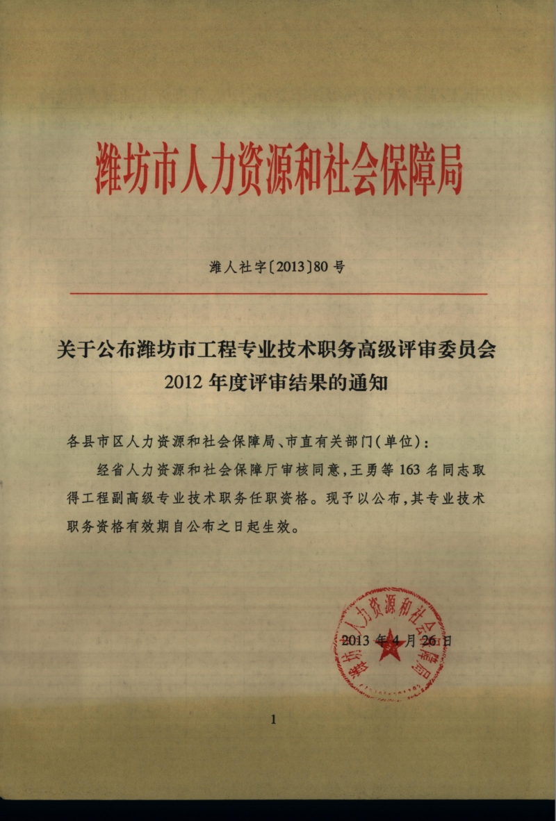 关于公布潍坊市工程专业技术职务高级评审委员会2012年度评审结果的通知.pdf