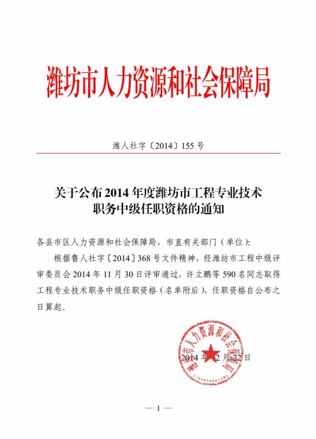 关于公布2014年度潍坊市工程专业技术职务中级任职资格的通知