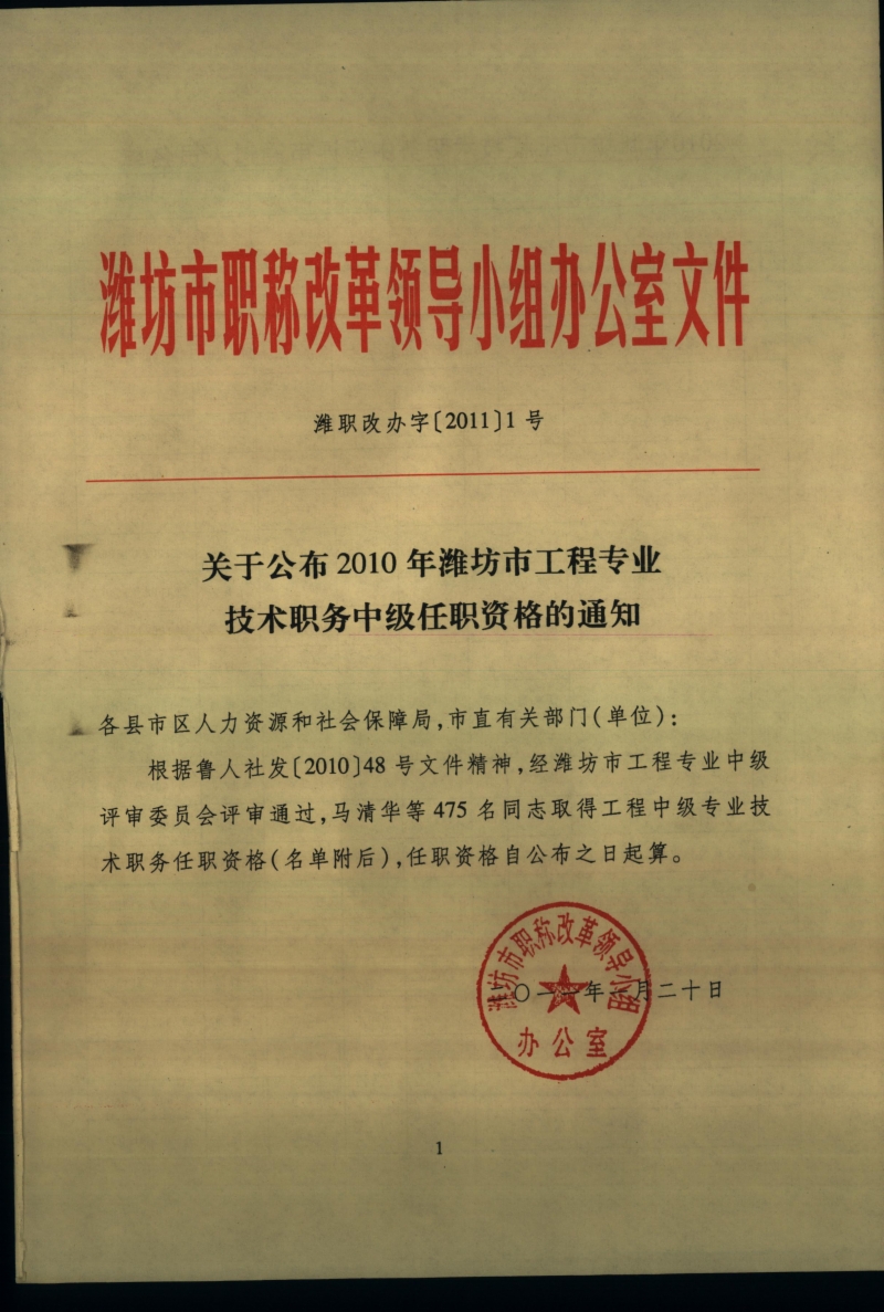 关于公布2010年潍坊市工程专业技术职务中级任职资格的通知